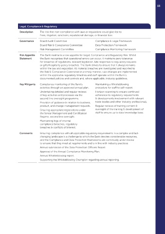 Risk Appetite The Bank maintains a low appetite for Legal, Compliance and Regulatory Risk. Whilst