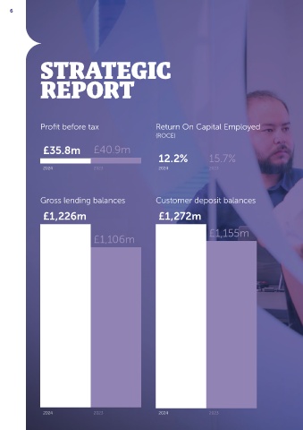 6 STRATEGIC REPORT Profit before tax Return On Capital Employed (ROCE) £35.8m £40.9m 12.2% 15.7% 2024 2023 2024 2023 Gross lending balances Customer deposit balances £1,226m £1,272m £1,155m £1,106m 2024 2023 2024 2023
